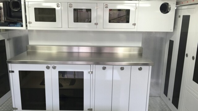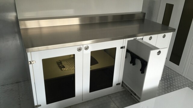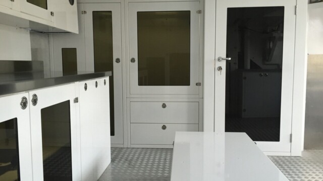 A laboratory work station with gear storage everywhere possible. Requested storage for Sea Bobs, seating area and storage/sing cabinet with several separate cabinets and gear storage areas