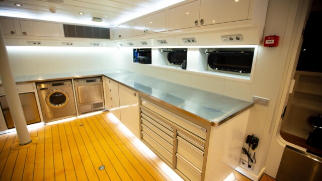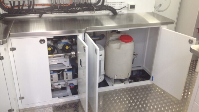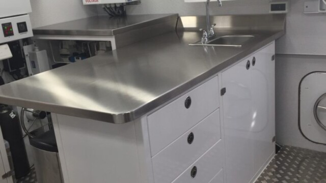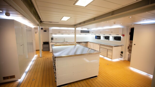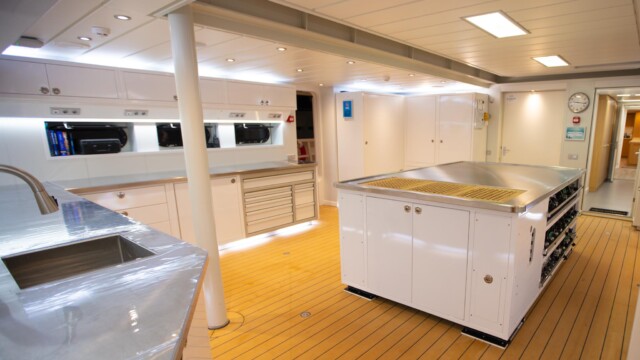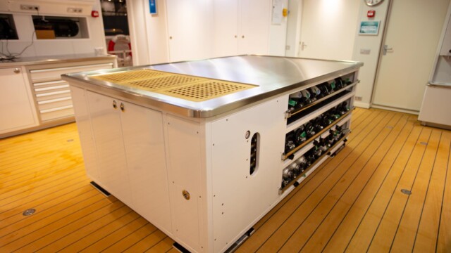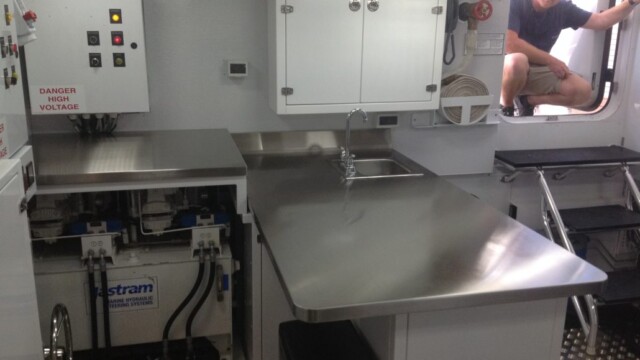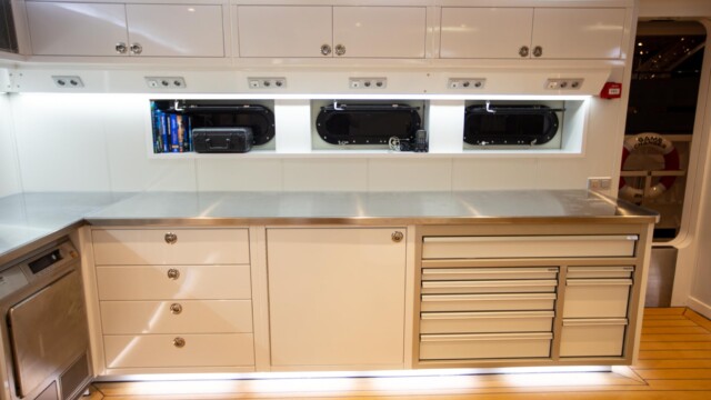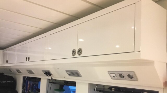 A remote install in Europe with a full dive locker, laboratory set-up, air ride island and custom equipment incorporated in the design build. Power points, lighting, remote air positions and water positions were provided by A&R Marine with assistance of the yard. All wet cabinets have drying systems installed.
