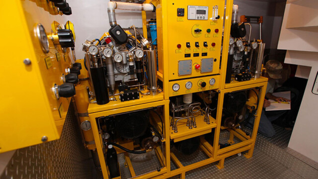 A custom Nitrox system with re-Dunant HP compressors, storage, air for firefighting bottles and remote fill capabilities. System was built in old Sauna position. Custom paint was requested.