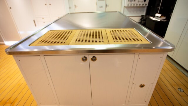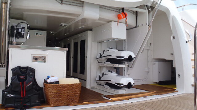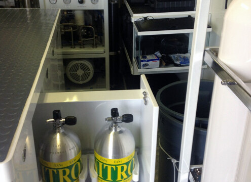 A complete build of a system and the storage requested by ownership to accommodate studies by students on board. System included a lab table, Aquarium and 12 diver storage and fill system. The Nitrox system was water cooled and a remote cascade fill panel was installed inside an A&R Marine upper cabinet. The lab table doubled as SEABOB pull out storage, gear storage and pull out tank storage. Every space available was filled with storage furniture as requested by the owner.