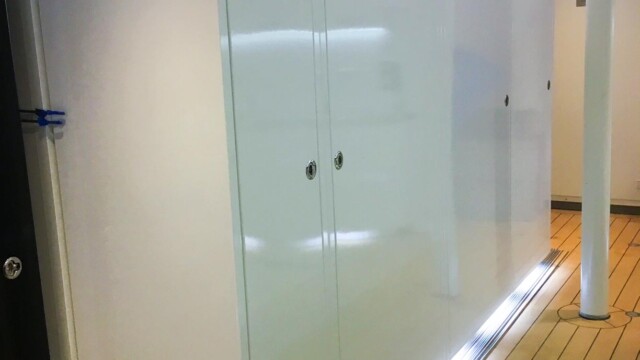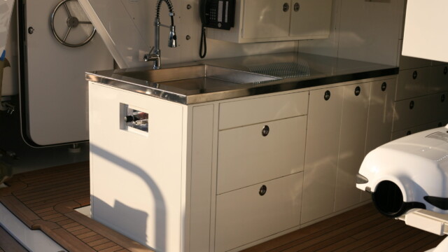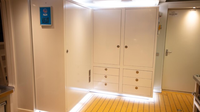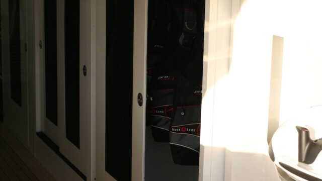 The Client’s Request: To build a dive locker in an existing space to show off the lazarette when in port and serve as an owner’s beach area when on site. A clean look was requested with lighted storage to show off the equipment. Wet equipment storage was desired, as well as a shower/head in the area.
